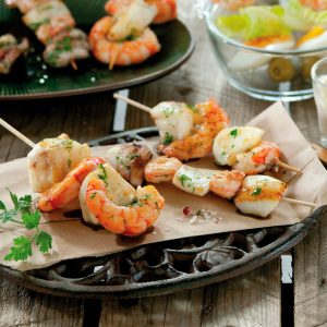 ¿Quieres sorprender a tus clientes con unas ricas brochetas de gambón y volador? Pues esta receta está de moda y