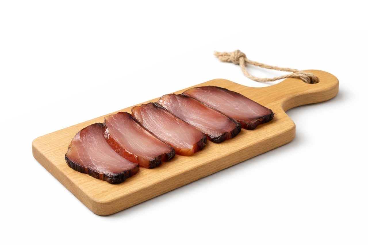 Mojama de bonito elaborada con lomos seleccionados y curados mediante salazón tradicional, de sabor intenso y textura firme. Un producto listo para consumir, ideal para aportar un toque premium y auténtico a cualquier elaboración.