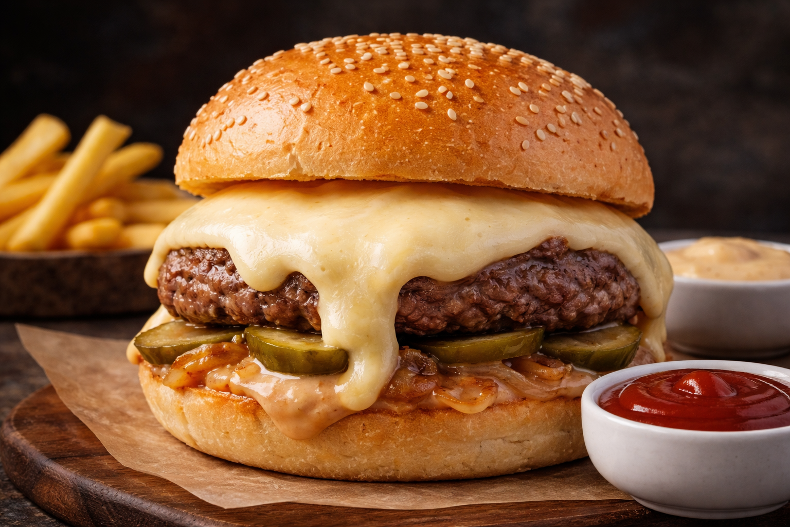 En esta receta, el raclette se funde directamente sobre la carne caliente, creando una capa envolvente que potencia el sabor sin ocultar el resto de ingredientes. La combinación con cebolla caramelizada, pepinillo y una salsa suave aporta equilibrio entre intensidad, dulzor y frescura.