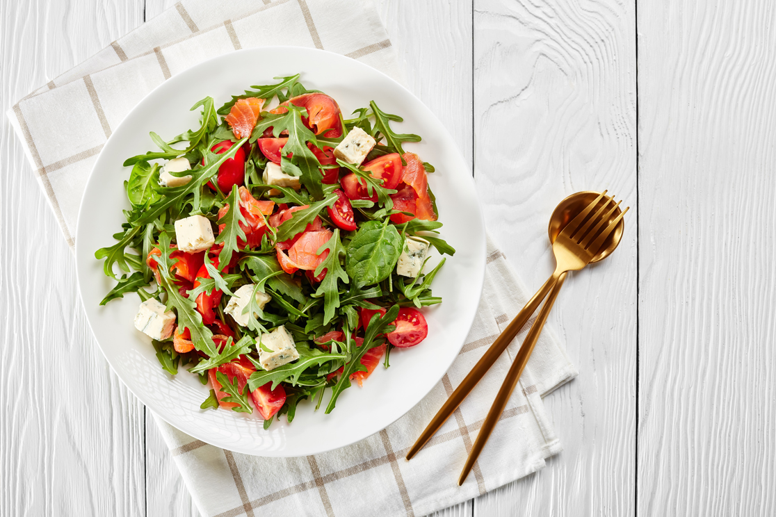 Ensalada fresca de rúcula, tomate y dados de queso tipo feta