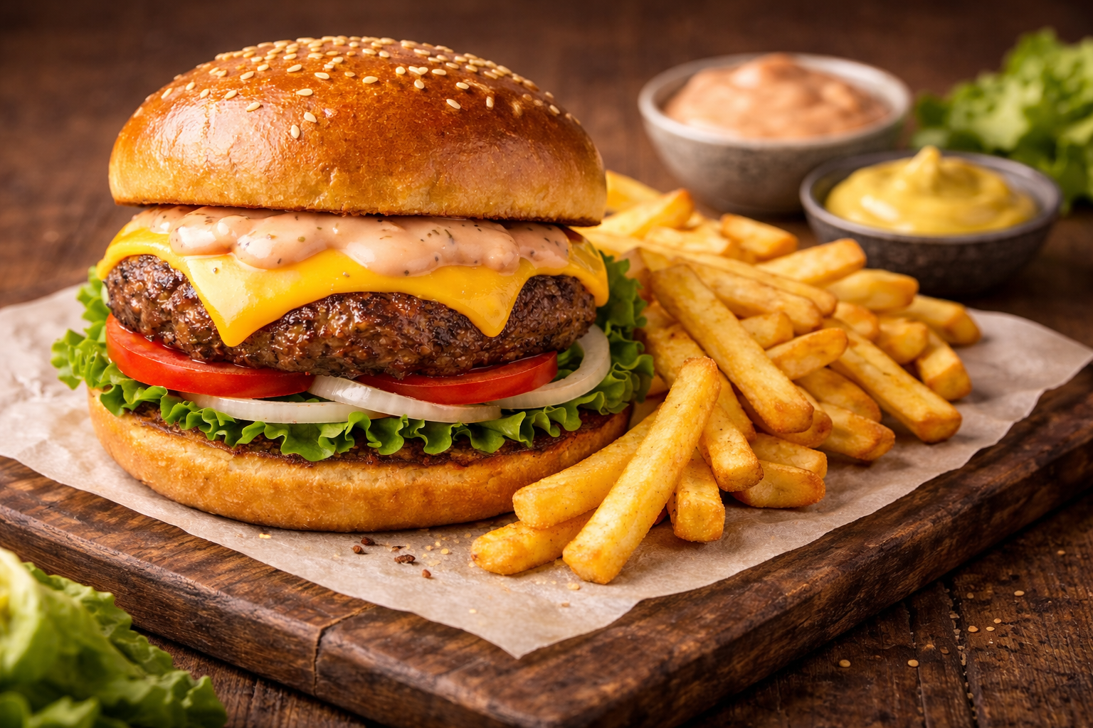 El secreto está en el equilibrio: una carne jugosa en su punto, un pan ligeramente tostado y el cheddar perfectamente fundido que se adapta a la hamburguesa sin perder su textura. La combinación con ingredientes frescos como lechuga, tomate y cebolla, junto con una buena salsa de hamburguesa, crea una experiencia completa, sabrosa y muy apetecible.