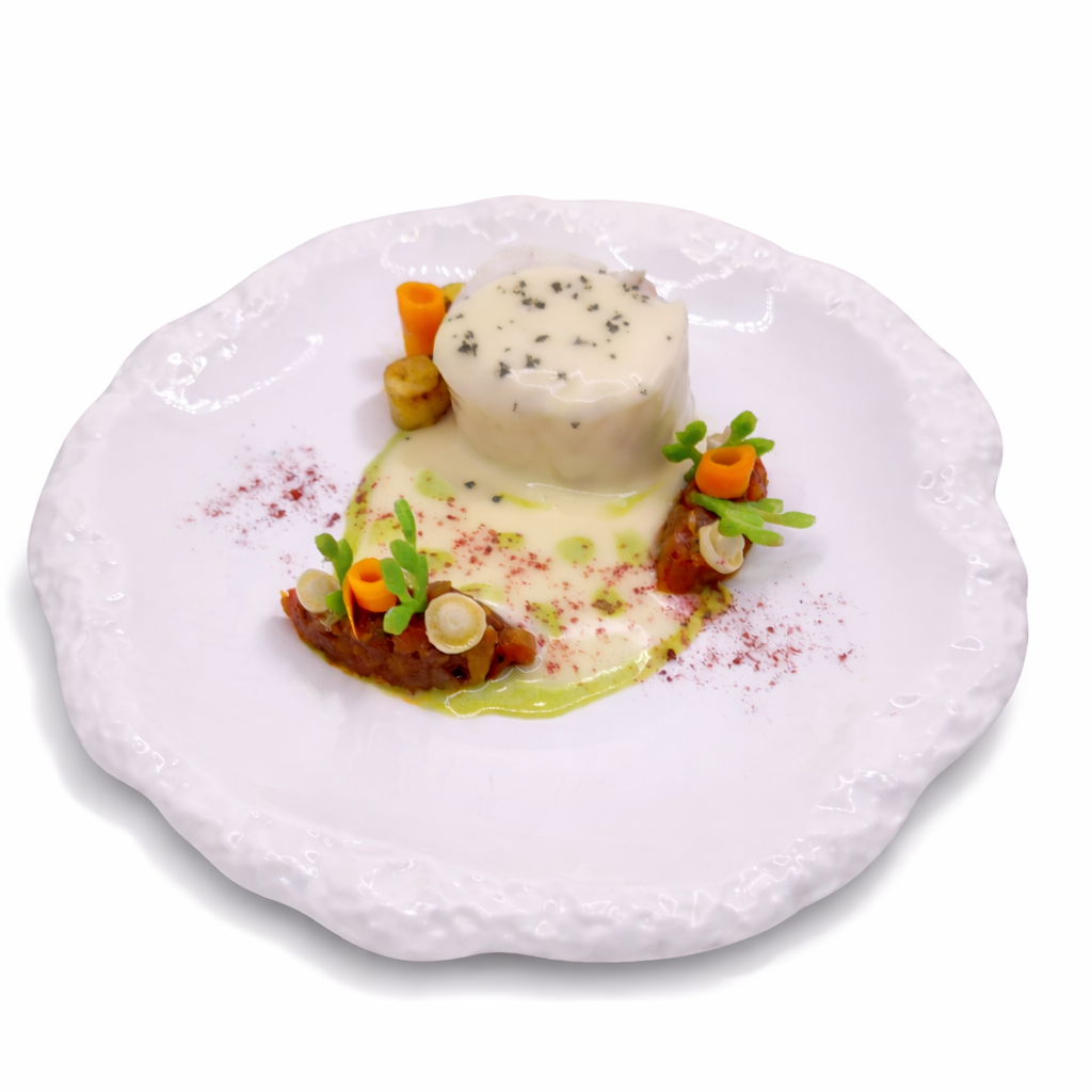 Una receta elegante donde el lomo de fogonero se cocina suavemente y se presenta prensado para conseguir una textura firme y jugosa. Se acompaña de un pilpil cremoso, que potencia el sabor del pescado, y de guarniciones de temporada que aportan frescura, color y contraste de texturas. El resultado es un plato equilibrado, delicado y visualmente atractivo.