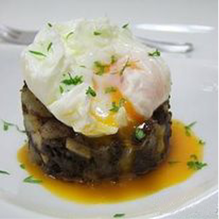 Sirve inmediatamente para disfrutar de la yema fundente sobre la morcilla caliente.