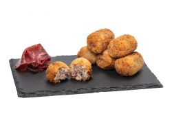 Croqueta con rebozado crujiente y relleno cremoso, que resalta el sabor intenso de la cecina en cada bocado. Una opción perfecta como tapa, entrante o para enriquecer tu carta.