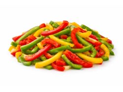 Mezcla de pimientos verdes, rojos y amarillos en tiras, listos para usar en salteados, guarniciones, pizzas y todo tipo de platos.